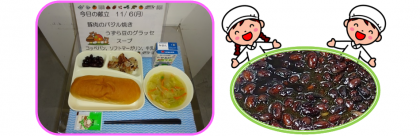 今日の給食では、うずら豆を砂糖、オリーブ油を使って煮含め、甘くてつやのある煮ものにしています。