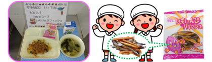 「いもけんぴフィッシュ」は、カタクチイワシの稚魚の煮干しを塩、砂糖、水あめなどで味付けしたものと、さつま芋を油で揚げて砂糖で味付けした芋けんぴを合わせた製品です。いわしとさつま芋はどちらも国産のものを使用しています。不足しがちなカルシウムの摂取量増加と、噛み応えのある食品で咀嚼力を強化することを目標として学校給食用に考案されました。
