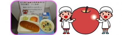 今日の給食では、青森県産の「サンつがる」という品種の林檎を提供しています。青森県で育成され、ゴールデンデリシャスと紅玉をかけ合わせた品種で、酸味はほどよく、甘みとのバランスがとれています。品種名の前に「サン」が付くのは、栽培時に袋をかけずに、太陽の光を浴びて育てた品種です。りんごは、病害虫に弱いことから、一つずつ袋をかけて育てることが多いですが、着色や貯蔵性などを向上させ、また労力の軽減にもつながることから、袋をかけない栽培法がすすめられているそうです。