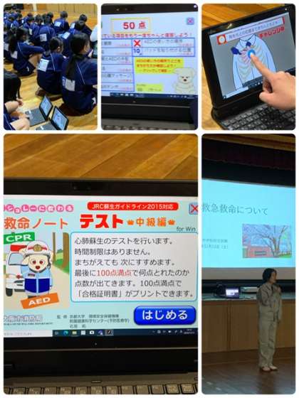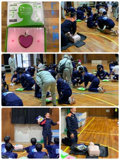 3年生は体育館で救急救命についてのDVD視聴のあと、一人一台端末を使用してボジョレー体験、消防署の方の指導のもと、心肺蘇生法として「あっぱくん」とAEDの使用について学びました。