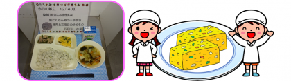今日の給食では、鶏肉(ささみ)、とうふ、コーン、みつばと、だしを加えた溶き卵を合わせてオーブンで蒸し焼きにしています。卵に他の食材を合わせることで、栄養価を高める効果もあります。
