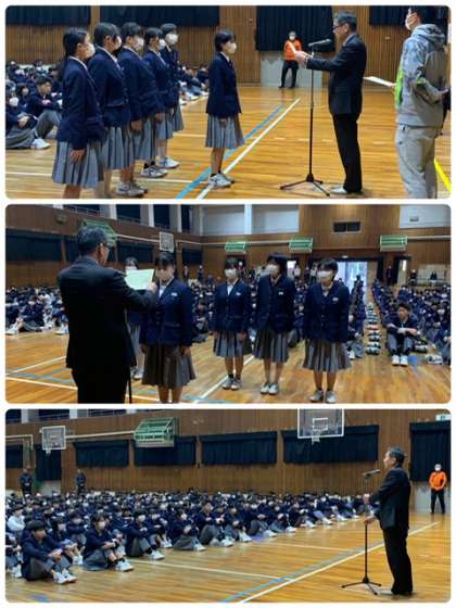 ・吹奏楽部の大阪市中文連アンサンブルフェスティバルの表彰(クラリネット二重奏‥銀賞・金管四重奏‥銅賞)が披露されました。