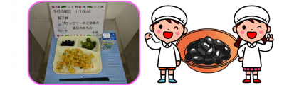 今日の給食では、乾燥した黒豆を熱湯に浸して戻し、砂糖としょうゆで味付けして、鉄釜を使ってじっくり煮込んだ手作りの煮豆として提供しています。