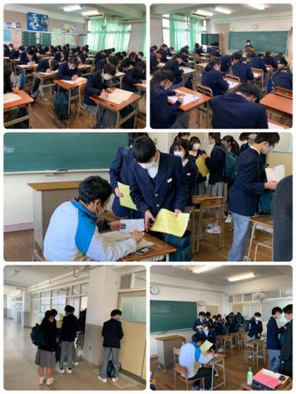 本日、3年生学年末考査の最終日です。2時間のテスト終了後は私立高校出願に学校ごとに出発しました。
