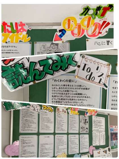 文化委員会のポスター、心に残る名言、私が選ぶ百人一首などの他に、誰の言葉か分かりませんが、なるほど・・と考えさせられる文章が掲示されています。一度読んでみてください。