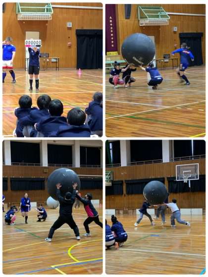 今日はキンボールのチームに来ていただき、ルールの説明や実践をしてもらいました。