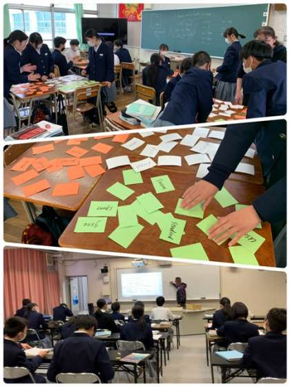 一つのクラスは、一般動詞の現在・過去・過去分詞をカードを使って学んでいます。