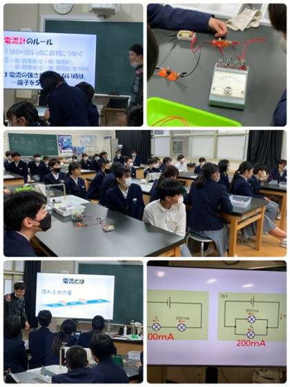 電流計の使い方で、直列や並列にして乾電池と豆電球を接続し、電流を測っています。