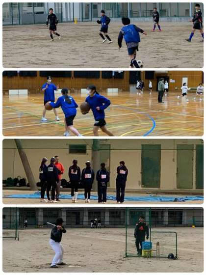 ●運動場ではサッカー、ソフトボール、野球部が、体育館では女子バスケットボール部が練習しています。