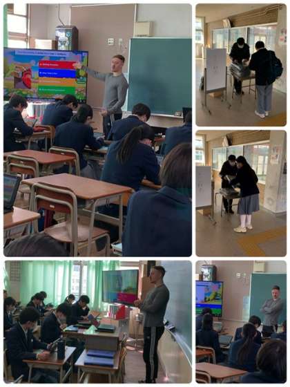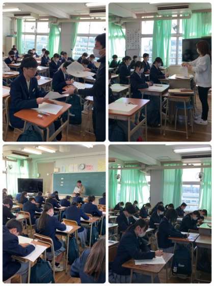 英語ではC-NETの先生がリスニングのクイズの答えを端末で生徒が解答しています。