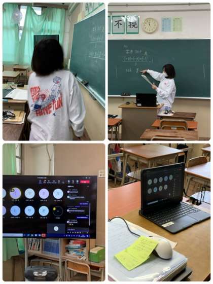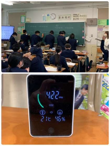 3月5日(火) 公開日 2024/03/05 更新日 2024/03/05 出来事 ●1年音楽 和太鼓の授業で太鼓にチャレンジ。 ●2年数学 式の展開と因数分解 文字式の乗除を前で解いています。 教室には、二酸化炭素の濃度を測る装置があり、濃度が高くなると警告音が鳴り、ドアを開けて換気するようにしています。 ●3年リモート授業 学年休業のため、端末でリモート授業やデジタルドリルに取り組んでいます。