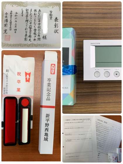 ●地域と同窓会からの卒業記念品が配布されました。(平野西地域からの皆勤賞の記念品は後日渡されます)