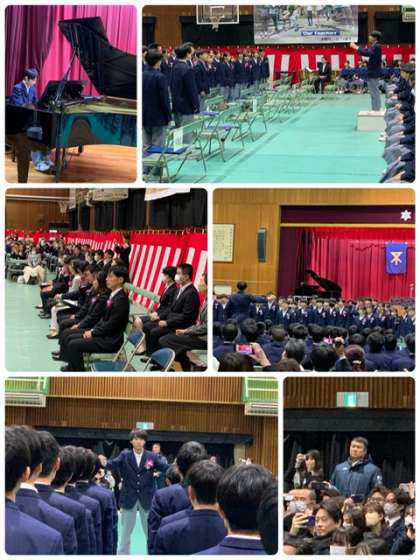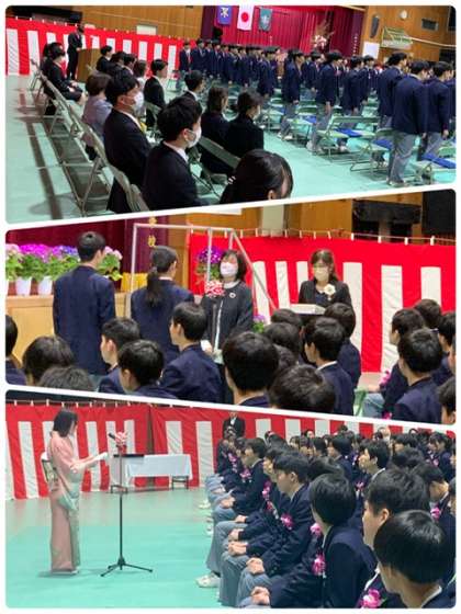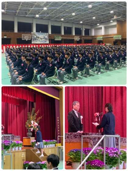卒業式 4 公開日 2024/03/13 更新日 2024/03/13 出来事 ●卒業生答辞 3年間の想いと、教職員・地域、そして保護者と仲間への感謝が伝わりました。 ●最後に3年生全員で卒業の歌「僕のこと」を合唱しました。 ●閉式の辞のあと、同窓会とPTAから卒業記念品の目録が卒業生代表に手渡されました。 引き続き、卒業生保護者代表の謝辞で心余るお言葉を学校に頂きました。ありがとうございました。
