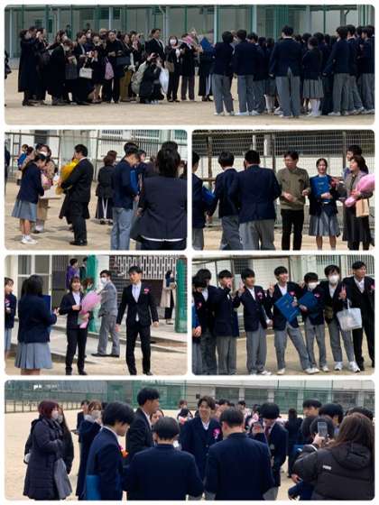 卒業式 6 公開日 2024/03/14 更新日 2024/03/14 出来事 ●花道を通り正門を出て、東門からグランドに戻り各々に記念写真を撮影しています。 コロナ禍も明け、通常の卒業式が無事に終了しました。 卒業生の皆さん、ご卒業おめでとうございます。これからの未来が素晴らしいものになりますように、心より祈っています。
