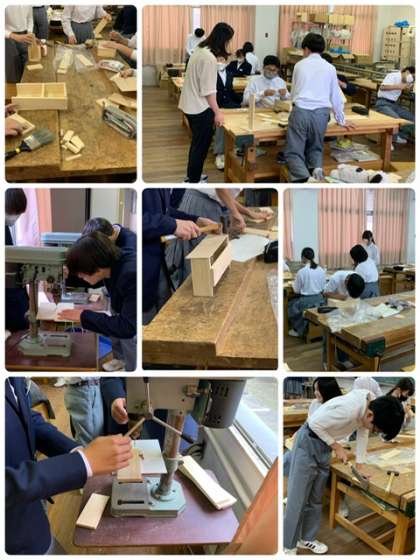 技術で木工製作。決まった材料の木材を使用して、好きに設計し棚やケースを作っています。