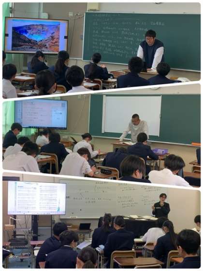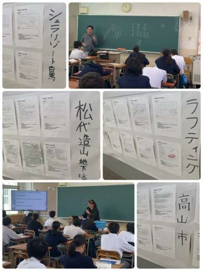 廊下には修学旅行に向けて、調べたレポートが掲示されています。