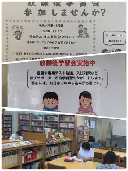 5月14日(火) 公開日 2024/05/14 更新日 2024/05/14 出来事 ●本日、放課後学習会を実施しています。 基本、毎週火曜と木曜日に開催し、図書館で自学自習に取り組み、学びサポーターがサポートしてくれます。 教室に案内と申し込み書を設置していますので、利用してください。 ●3年生は放課後、来週の修学旅行に向けて取り組みをしています。 ●軽音楽部 放送室や教室に分かれて練習しています。