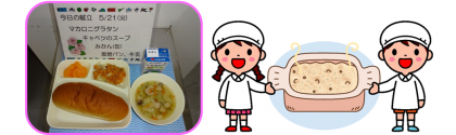今日の給食では、米粉のマカロニのほか、鶏肉、たまねぎ、グリンピースなどを使用して、ホワイトソースで煮たものに、粉末チーズ、米粉のパン粉をかけてオーブンで焼いています。