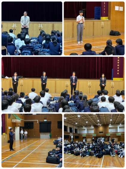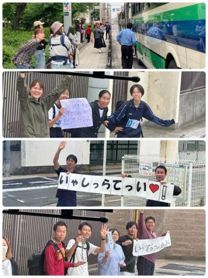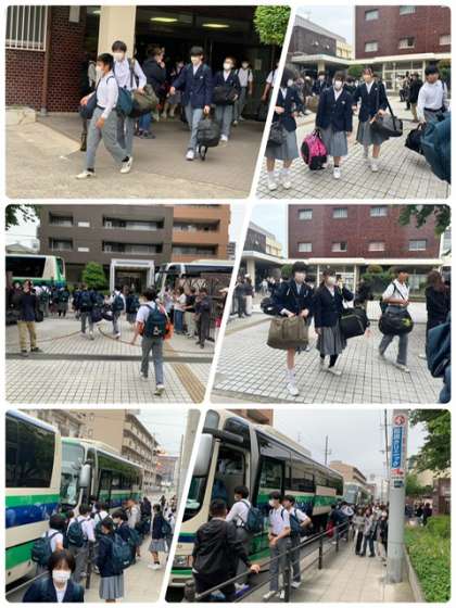 修学旅行1日目 1 公開日 2024/05/23 更新日 2024/05/23 出来事 5月23日(水) ●6時40分集合、健康観察・出発式 校長先生、生徒代表挨拶と添乗員・写真屋さんの紹介などが行われました。 ●7時00分 学校出発バス乗車 「お願いします」 ●7時10分 バス出発 たくさんの見送りありがとうございます。 「行ってきます!」