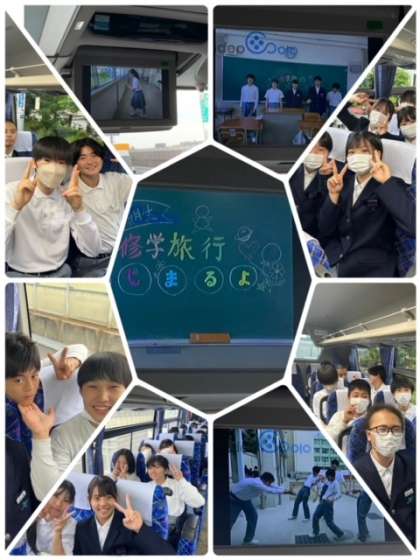バス内では早速、レク係の作成した修学旅行オープニングビデオ映像が流れています。