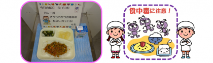 平年では、近畿地方の梅雨入りは6月6日ごろとなっていますが、今年は少し遅くなりそうとの予想です。しかし、これから梅雨に入り雨の日が多くなると、暑さに加えて湿度も高まり、ジメジメとした日が続きます。私たちにとっては、あまり気持ちの良くない環境であっても、細菌たちにとっては最も良い環境となり、この時期は一年間で最も細菌性の食中毒が多くなります。おもな症状は、嘔吐、下痢、発熱などですが、場合によっては命にかかわることもあります。給食室でも細心の注意を払っていますが、ご家庭においても十分ご注意ください。