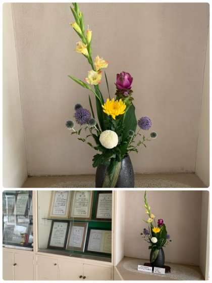 生け花ボランティア 公開日 2024/07/03 更新日 2024/07/03 出来事 2週間に1度、地域の方々が花を生けに来てくださっています。 今回はグラジオラス、クルクマ、ルリ玉アザミ、菊を生けていただいています。 いつも、ありがとうございます。