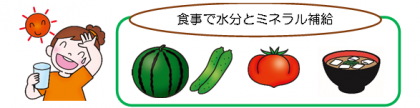 そのためには、経口補水液、スポーツドリンク、水分と合わせて塩分を補給するタブレットなどの利用も有効ですが、食事のときに、スイカ、きゅうり、トマトなどの水分の多い食品や、みそ汁、スープなどの汁物を利用することも効果的です。とくに汁物は塩分を含むとともに、具として野菜や海藻などを使うことでミネラル成分もしっかりとることができますので、たいへん効果的です。食事と水分をうまくとることで、熱中症を予防しましょう。
