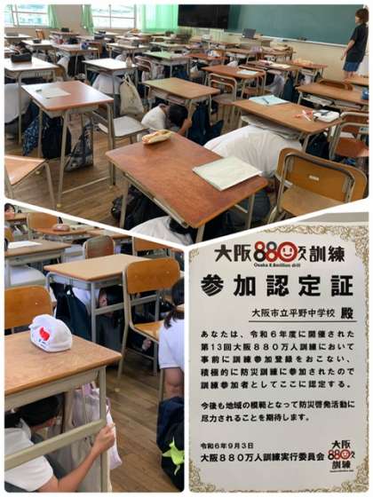 教室では、担任の先生のお話を聞き、今日の訓練の説明を受けて、実際に机の下に隠れたりしました。