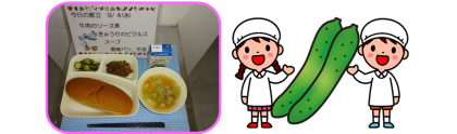 今日の給食では、スチームコンベクションオーブンで蒸したきゅうりを砂糖、塩、ワインビネガー、しょうゆを合わせて作った調味液につけ、即席のピクルスにしています。
