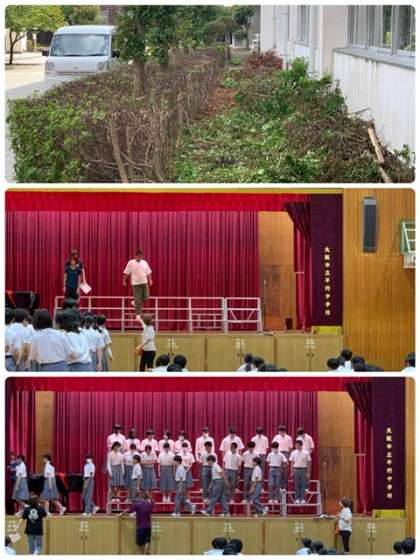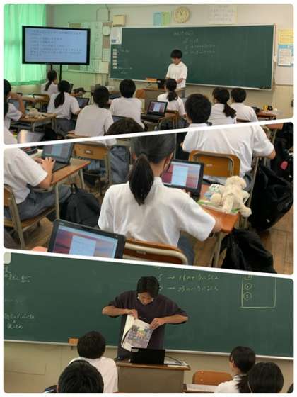 9月5日(木) 公開日 2024/09/05 更新日 2024/09/05 出来事 ●1年生社会科 国内旅行のプレゼンテーションを生徒が端末を使って発表しています。 ●夏の間に伸びた樹木の剪定を管理作業員さんがしてくださいました。 ●2年生が合唱コンクールの舞台移動の練習をしています。 ●1年生が体育大会の選手決定や学級旗のデザインを決めています。