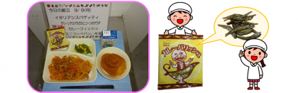 「カレーフィッシュ」は、大阪市の学校給食では、今回初めて導入された食品です。原材料としては、国産のかたくちいわしの煮干しを使用し、食塩、水あめ、砂糖、香辛料などでの味付けになっています。カレー風味の味付けになっていますので、従来から使用している「ミニフィッシュ」の味違い版のような製品です。
