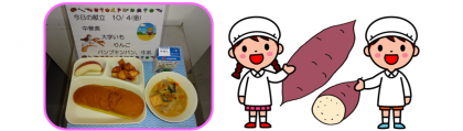 今日の給食では、油で揚げたサツマイモに、砂糖、塩、しょうゆ、水を煮詰めてつくった蜜をかけ、「大学いも」にしています。