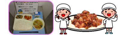 今日の給食では、鶏肉にしょうが、にんにく、砂糖、しょうゆ、ケチャップ、トウバンジャンで下味をつけ、スチームコンベクションオーブンで蒸し焼きにして、「鶏肉のチリソース焼き」としています。