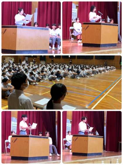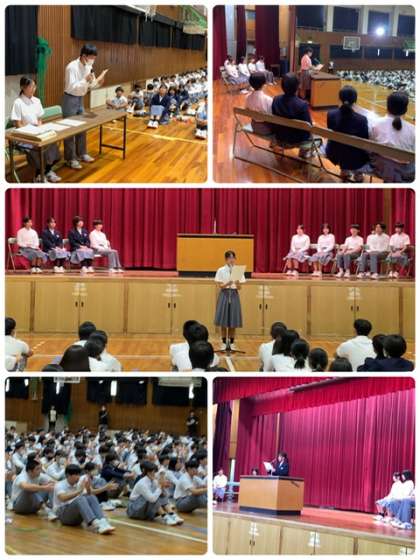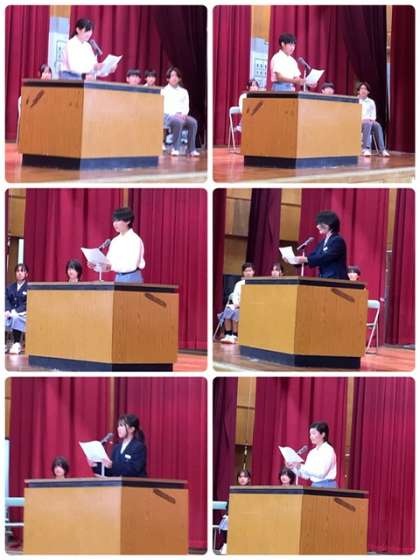 生徒会選挙 公開日 2024/10/10 更新日 2024/10/10 出来事 本日、6限生徒会の立会い演説と選挙が行われました。 選挙管理委員の司会進行のもと、会長・副会長・書記に5名の生徒が立候補してくれました。 どの候補者も真剣に抱負を述べ、応援演説も立派に応援してくれました。 この後、教室に戻り、投票がおこなわれました。 投票の結果は明日行われ、21日(月)の全校集会で認証されます。