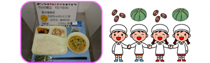 今日の給食では、小豆とかぼちゃを合わせて煮た「いとこ煮」にしています。