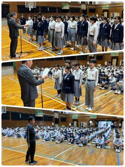 10月7日の事、1年生の男子生徒5名が道端で倒れられたお年寄りの方に気付き、かけ寄り声をかけてくれました。その様子に気づいた大人の方が救急車が呼んでくださったようで、校長先生から全体に内容が紹介されました。