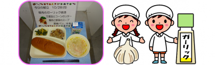 今日の給食では、豚肉と玉ねぎを合わせ、ワイン、塩、こしょう、しょうゆ、オリーブ油、そしてガーリックパウダーで味付けして焼いた料理として、献立名を「ガーリック焼き」にしています。