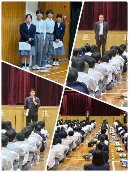 ●新たな生徒会の進行で全校集会が行われました。これからもよろしくお願いします。