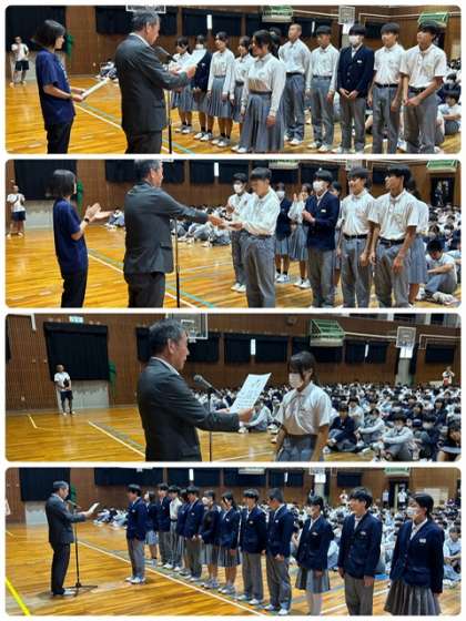 各学級を代表して、3年1組の学級代表、体育委員など各委員に認証状が手渡されました。皆さん、よろしくお願いします。