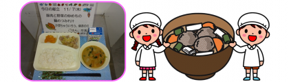 今日の給食では、「いわしだんご」の名の製品を使っており、手でちぎって摘み入れているわけではありませんが、円柱状に押し出して2〜3cm程度ごとに切ったような形で、つみれっぽくも見えますので、献立名は「鰯のつみれ汁」としています。
