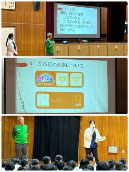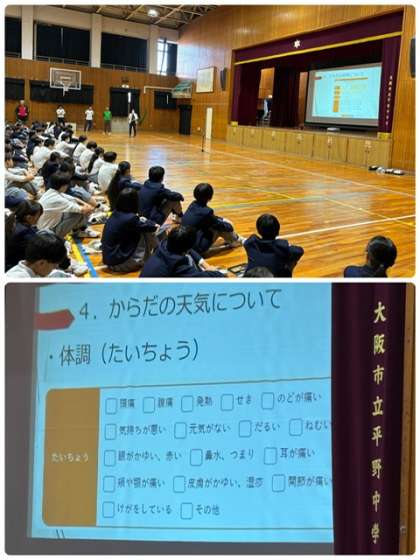 全校集会で生徒指導主事と養護教諭から「こころとからだの天気」についてお話がありました。