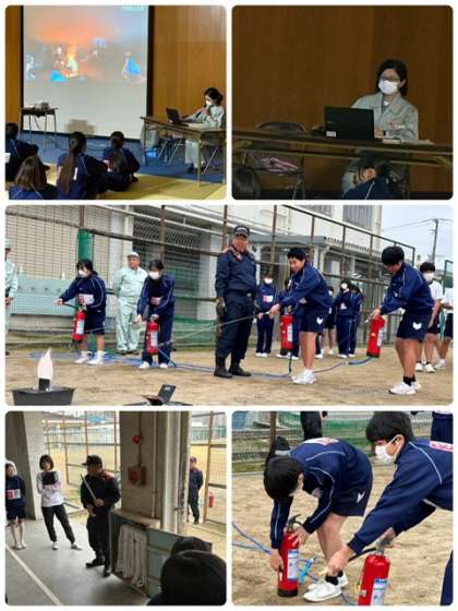 2年生は避難訓練訓練のあと、武道場と4号館前に分かれて、地域防災リーダーの方による火災DVDを視聴しての講話と消防署員による初期消火訓練を実施しました。