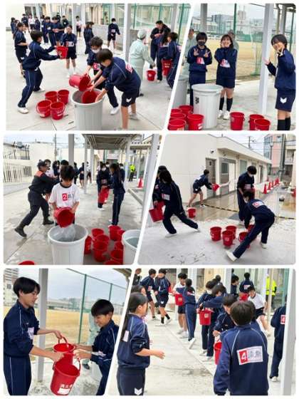 初期消火訓練では、屋内消火栓や消火器の使い方、バケツリレーによる消火を体験しました。
