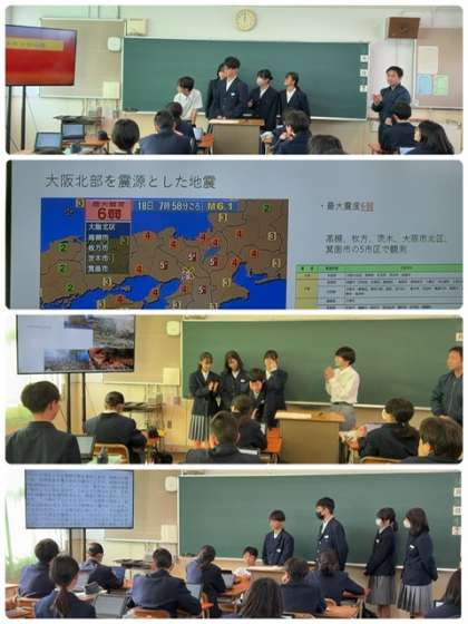 地震や防災について、班でタブレットを使って調べた事を前で発表しています。
