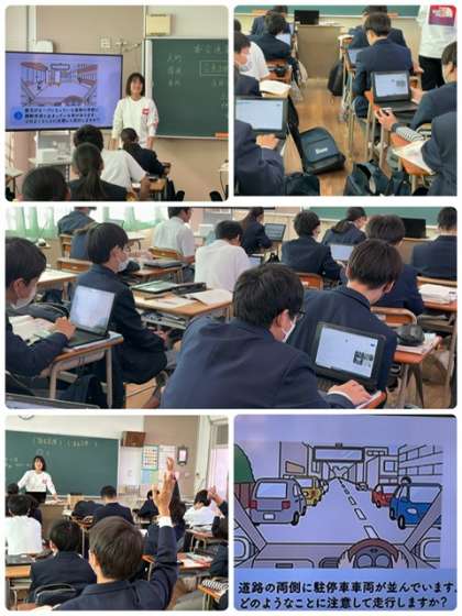 交通事故の防止について学習しています。道路交通法が11月に改正された内容を端末で調べたり、交通事故の顕在危険と潜在危険を考えました。