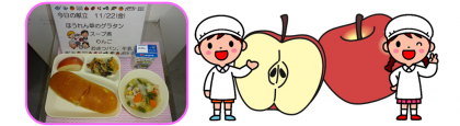 今日の給食では、青森県産の「シナノスイート」という品種の林檎を提供しています。長野県で育成された品種で、1978(昭和53)年に早生種の「つがる」と晩成種の「ふじ」の交配により誕生し、1996(平成8)年に商標登録されました。当初は公募により「あじぴか」の名がつけられましたが、同じ名で登録されたみかんがあったことから「シナノスイート」に変更されました。名前の通り甘くて、シャキシャキした食感が特徴となっており、10上旬ごろから11月にかけて旬を迎え、出荷量も多くなります。