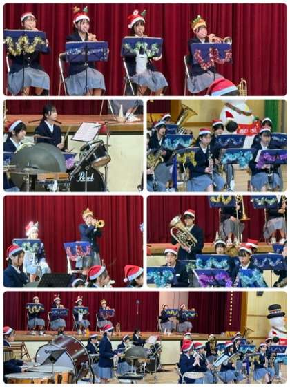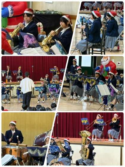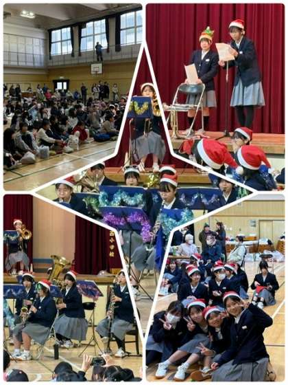 新平野西地域クリスマス会 公開日 2024/12/01 更新日 2024/12/01 出来事 吹奏楽部は、クリスマスメドレーに続いて、ディズニークラッシックを披露し、Mrs. GREEN APPLE メドレー、最後はYOASOBIのアイドルで演奏を締めくくりました。 吹奏楽部の演奏会の後は、ゲームなどが行われ、子どもたちにとってはお菓子やさまざまなプレゼントに素敵なクリスマス会となったようです。