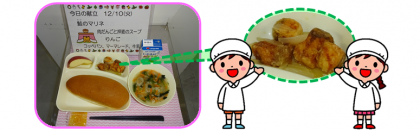 今日の給食では、角切りの鮭にでんぷんをまぶしてから揚げにし、うす切りにした玉ねぎと米酢、砂糖、オリーブ油、料理ワイン、塩でつくった漬け汁をかけて、マリネにしています。
