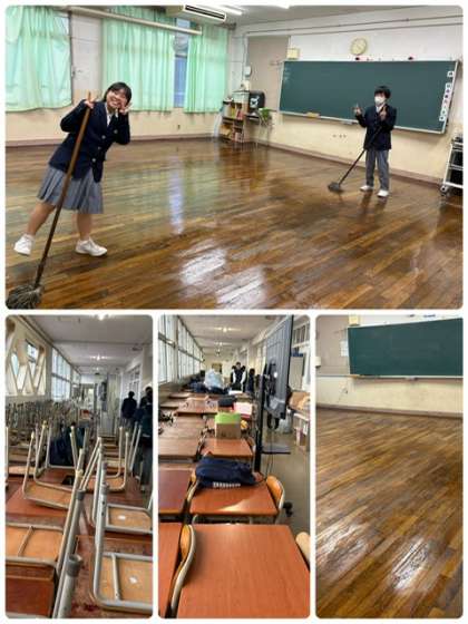 放課後、油引きをしました。机・椅子も廊下に出して、月曜まで乾かします。