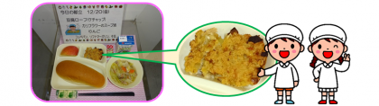 豆腐ローフは、豆腐とツナ缶、粒状にカットした大豆、たまねぎを混ぜ合わせ、砂糖、塩、しょうゆで味付けしたものをバットに入れ、オーブンで蒸し焼きにしたものです。豆腐を使用してミートローフ風に焼き上げていることから「豆腐ローフ」としています。今日はこれにケチャップを添えました。